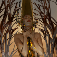 The image shows a woman who appears to be a figure in an artistic or symbolic context. She is adorned with golden attire and jewelry, suggesting she may represent a deity or