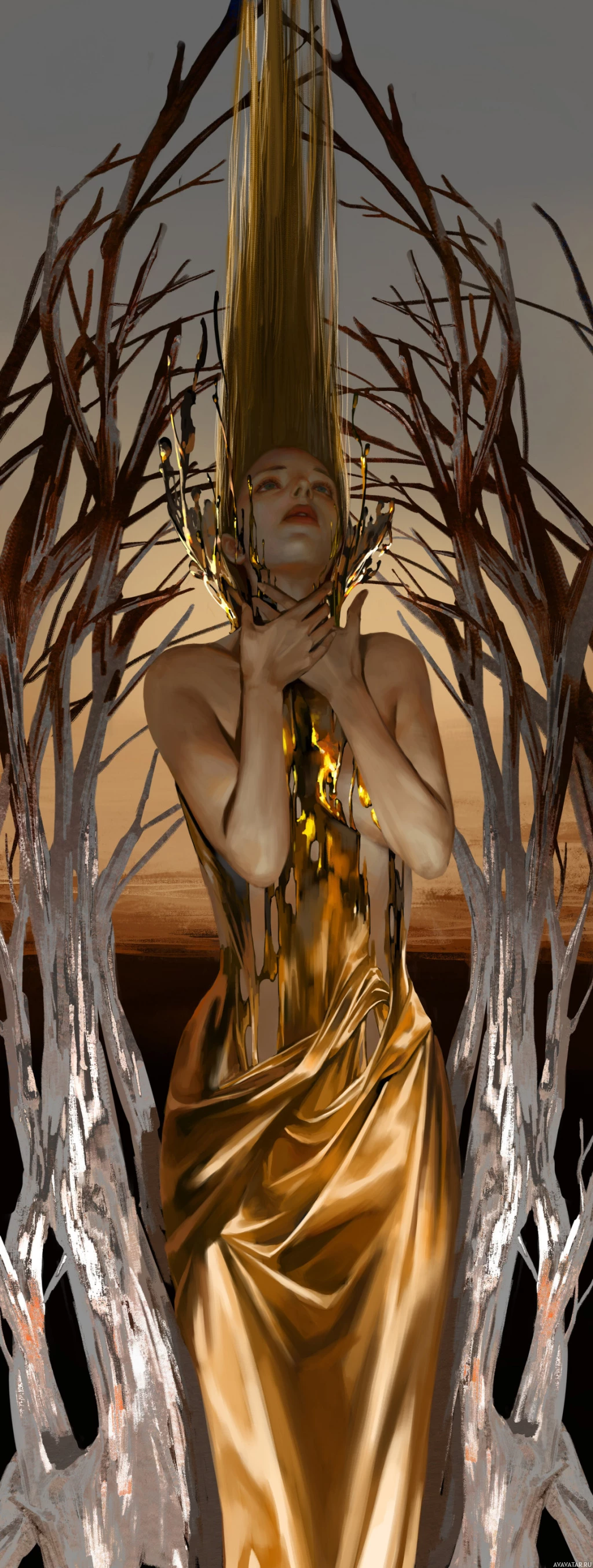 mythical character from a specific cultural tradition. Her pose is serene and contemplative, adding to the overall mystique of the image. The background features abstract tree-like structures, which could signify nature or