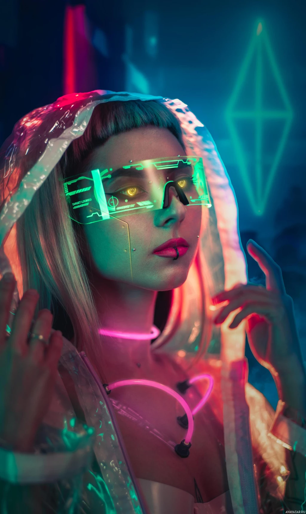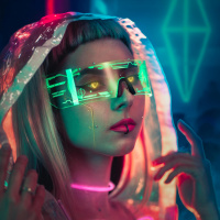 hooded cloak and reflective clothing with neon lights. They are wearing sunglasses that have LED strips on them. The setting appears to be