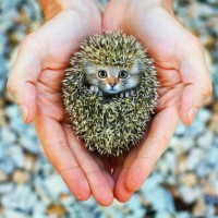 a human hand cradling a baby hedgehog. The hedgehog, with its spines erect, appears to be in the foreground and is