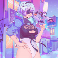 This is an illustration of a female character from the video game "Nier: Automata." She is depicted in a cyberpunk style, with futuristic elements such as mechanical limbs and glowing lights. The background suggests a neon-lit cityscape at night, which complements the cyberpunk theme.