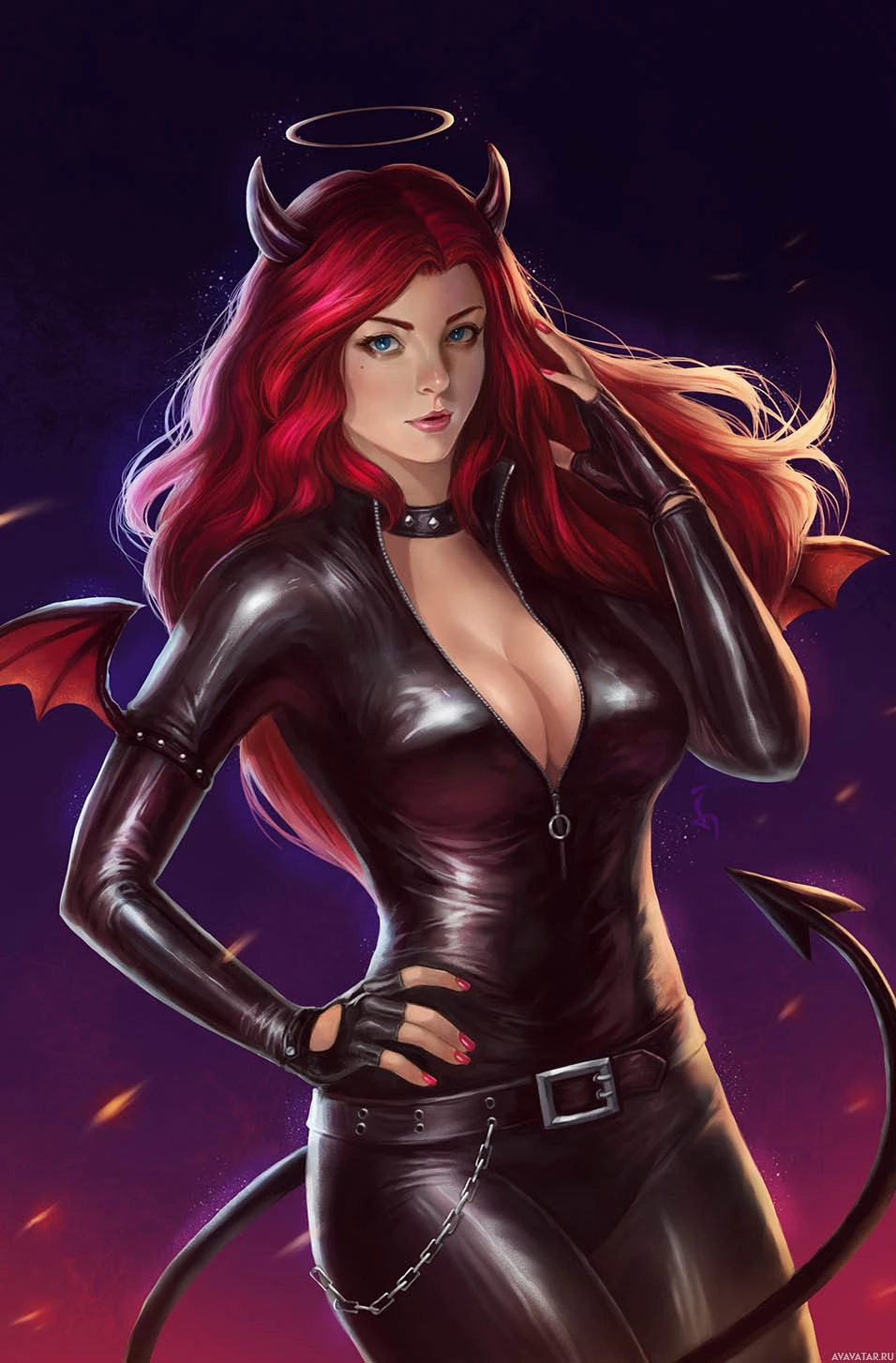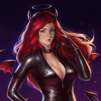 a female character with red hair, wearing a black leather outfit that resembles a dominatrix or devil-themed costume. She has an angelic halo above her head and horns on the sides of her head, which is often associated with demonic or evil themes in