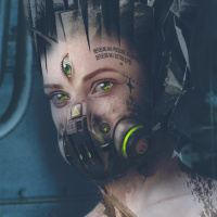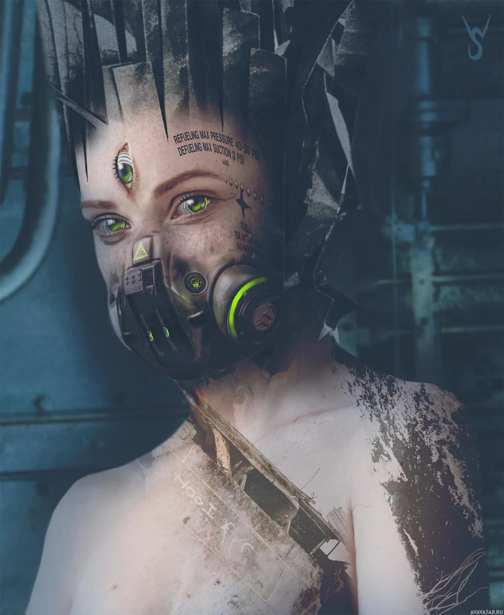 mechanical parts, suggesting a post-apocalyptic or dystopian theme. The individual has intricate tattoos on their arms and is wearing a respirator with a distinctive design that includes