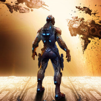 futuristic gear with a helmet, which suggests they may be involved in some form of advanced technology or space exploration. Behind them is a large, open space that appears to be