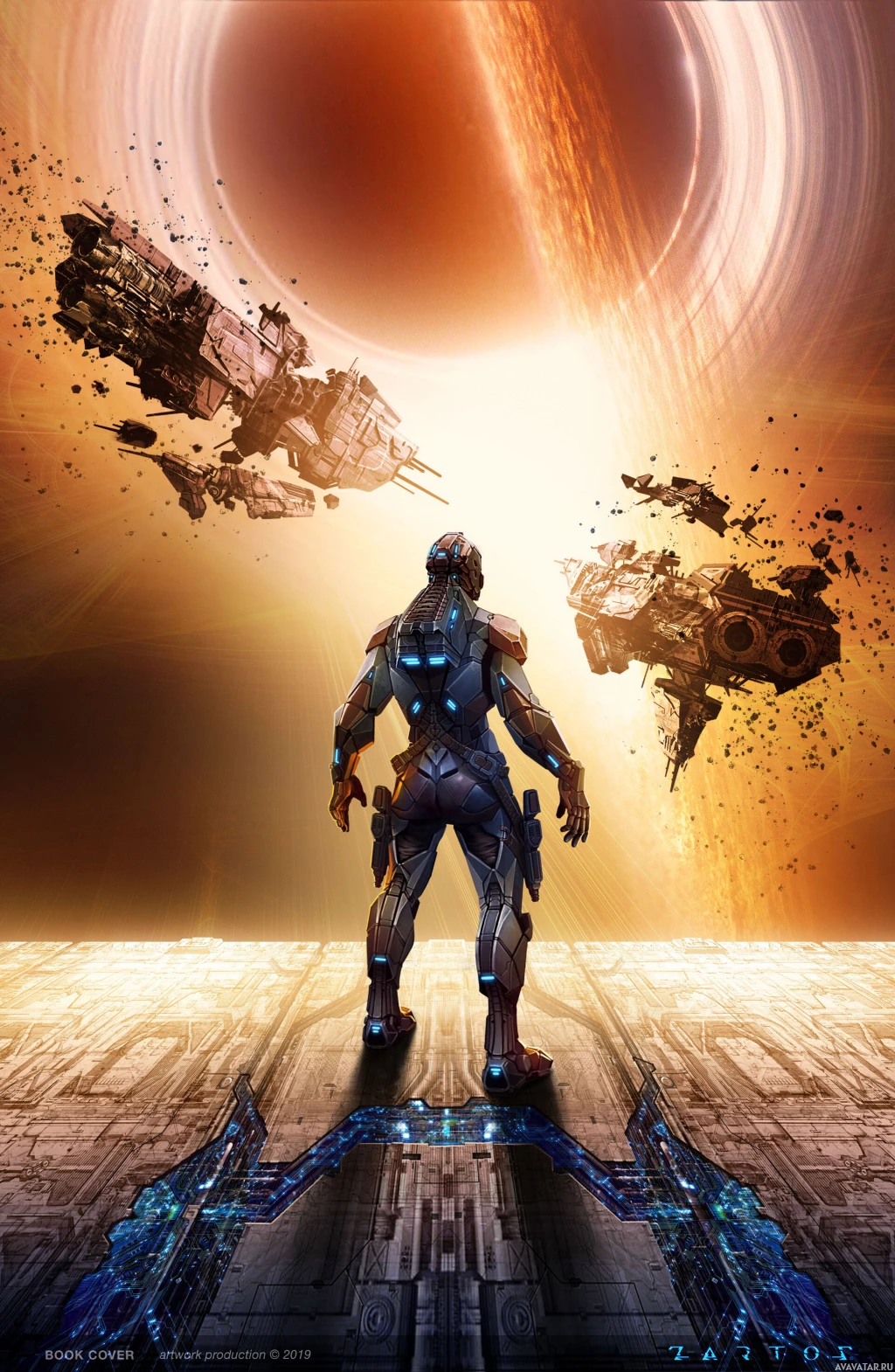 a science fiction scene. In the foreground, there's an individual dressed in
