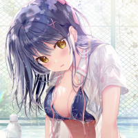 The image depicts an animated character who appears to be a young girl with purple hair. She is wearing a bikini and holding what looks like a water bottle. The background suggests she is outdoors, possibly near a pool or at a beach during the daytime under clear skies. It's evident that this image belongs to the "anime" genre of artwork.