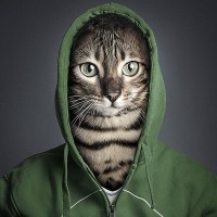 a hooded cat wearing a sweatshirt with the letter "G" on it. The cat is looking directly at the camera, giving the impression that it is posing for the photo. The background is neutral and does not provide additional context. This type of image is often created using