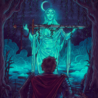 second individual has long, flowing hair and is holding what looks like a staff or wand. Behind them both is an ethereal or supernatural figure that resembles a saint or