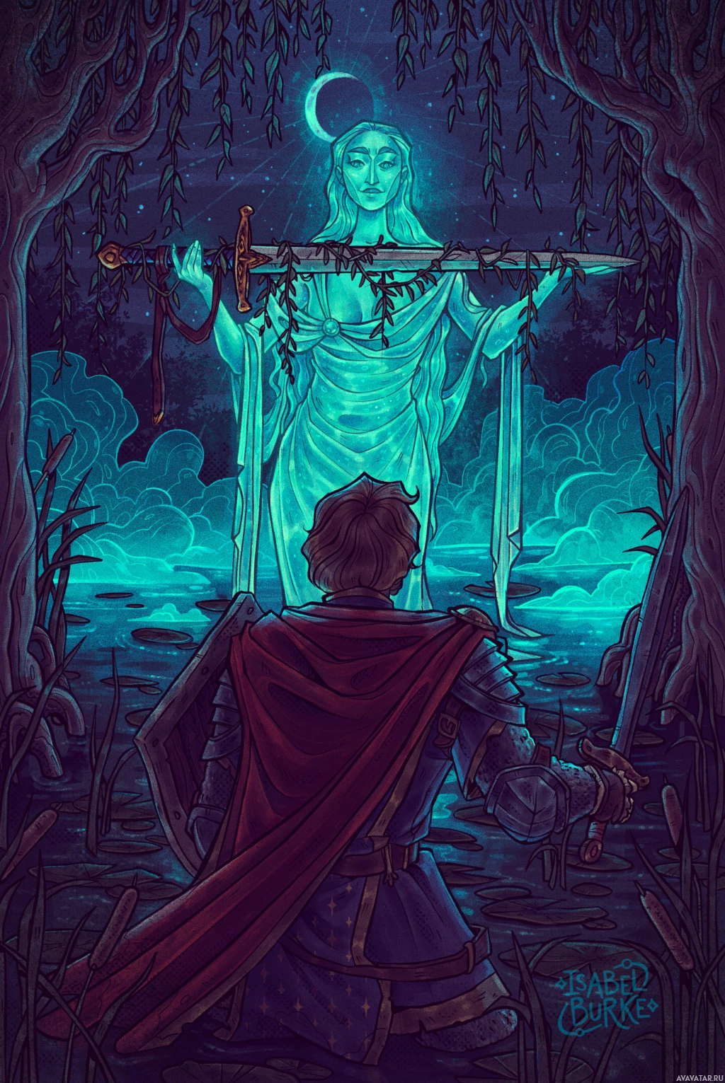 a fantasy scene with two individuals. One figure is standing in the foreground, dressed in armor and holding a sword, looking towards the other person who appears to be kneeling on one knee. This