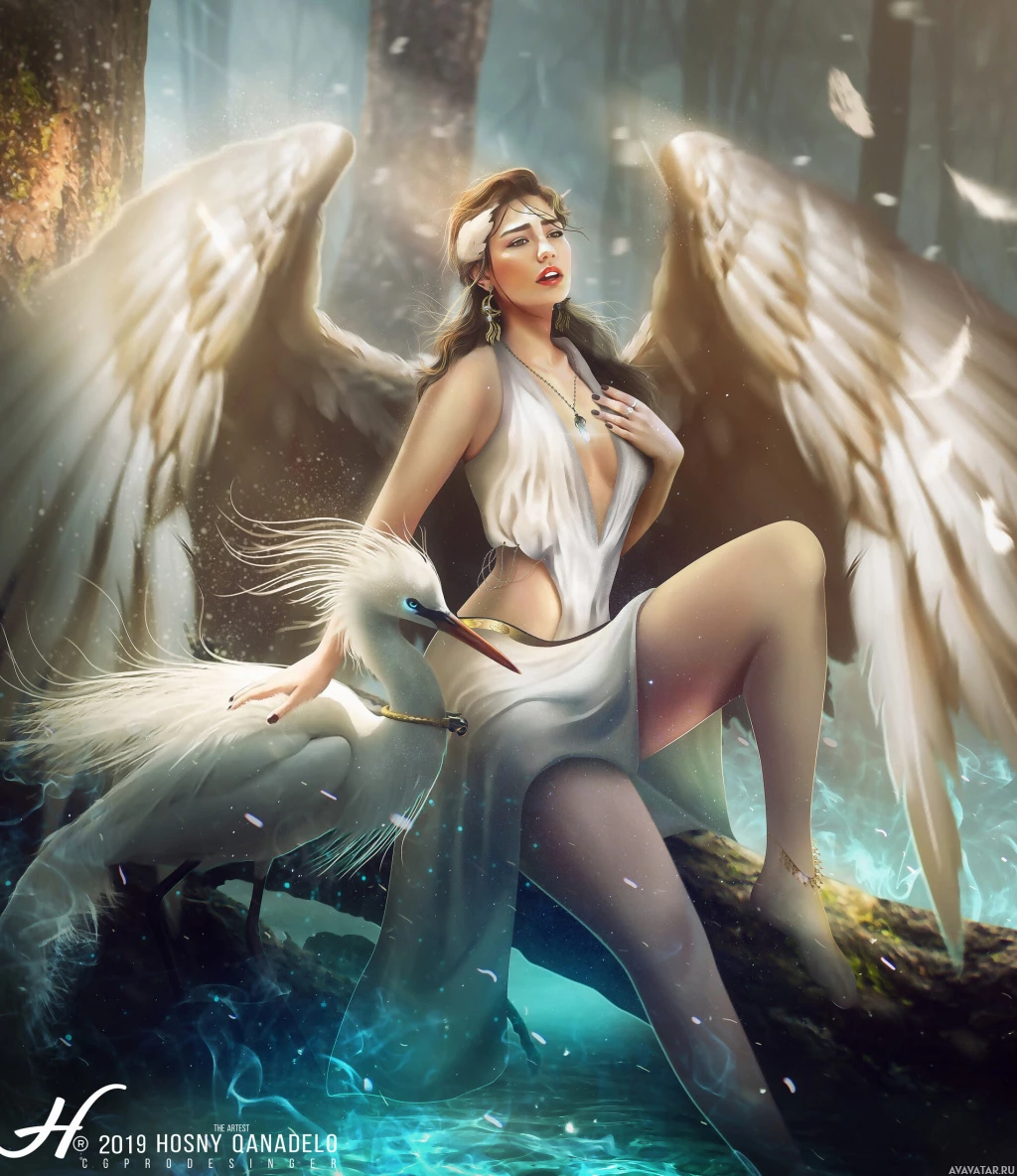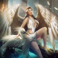 a white bird that appears to be a swan or goose, and her expression seems serene and contemplative. The overall mood of the artwork is fantastical and ethereal.
