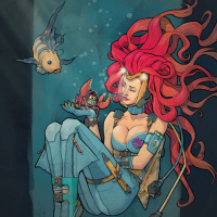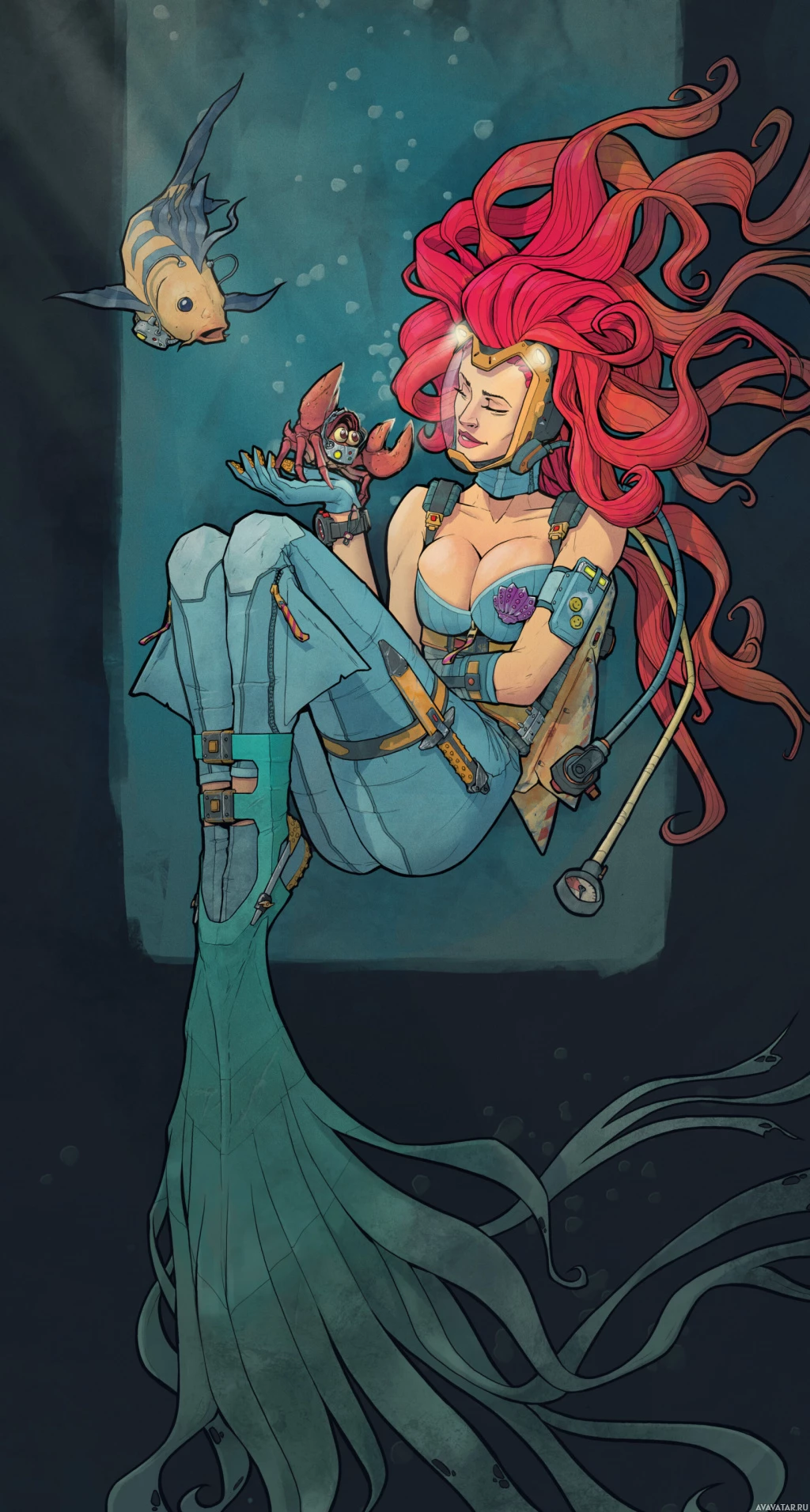 red hair and is depicted with mermaid-like features, including a tail. She is holding a seashell to her ear as if listening intently. She's wearing an outfit that seems to blend elements of human attire with those of a fish or