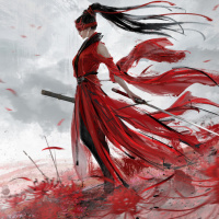 a female character dressed in a red and black outfit, reminiscent of traditional East Asian attire. She has long