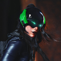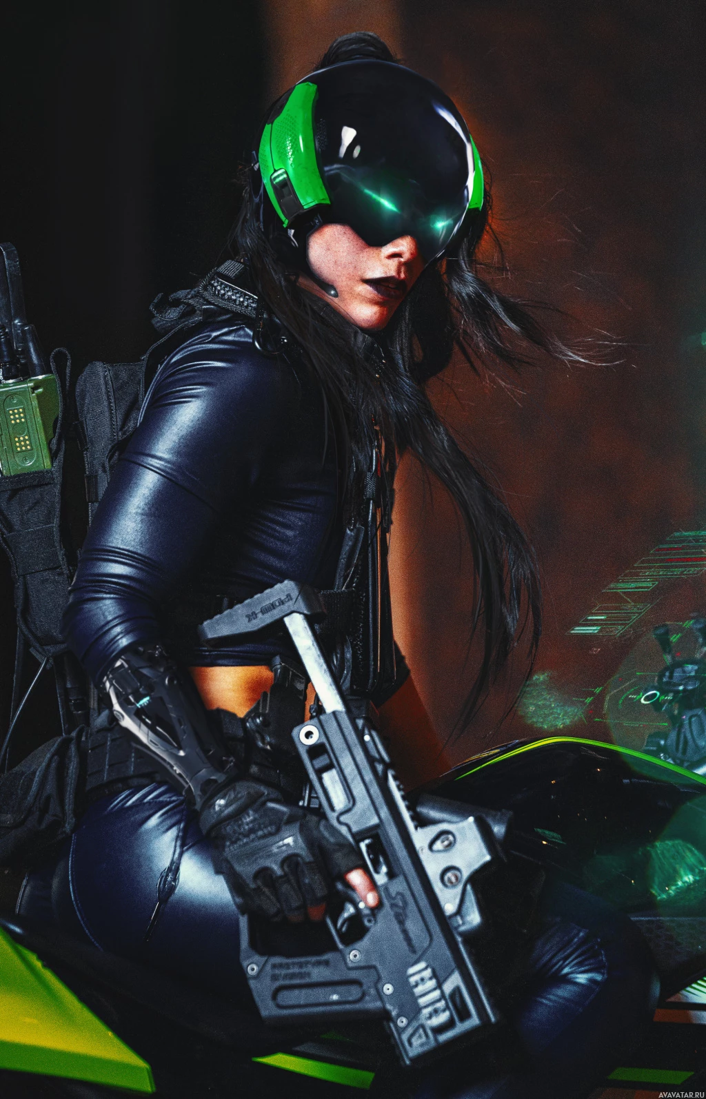 dark hair and is wearing a helmet with a green visor, which gives her an intimidating appearance. Her attire includes a black