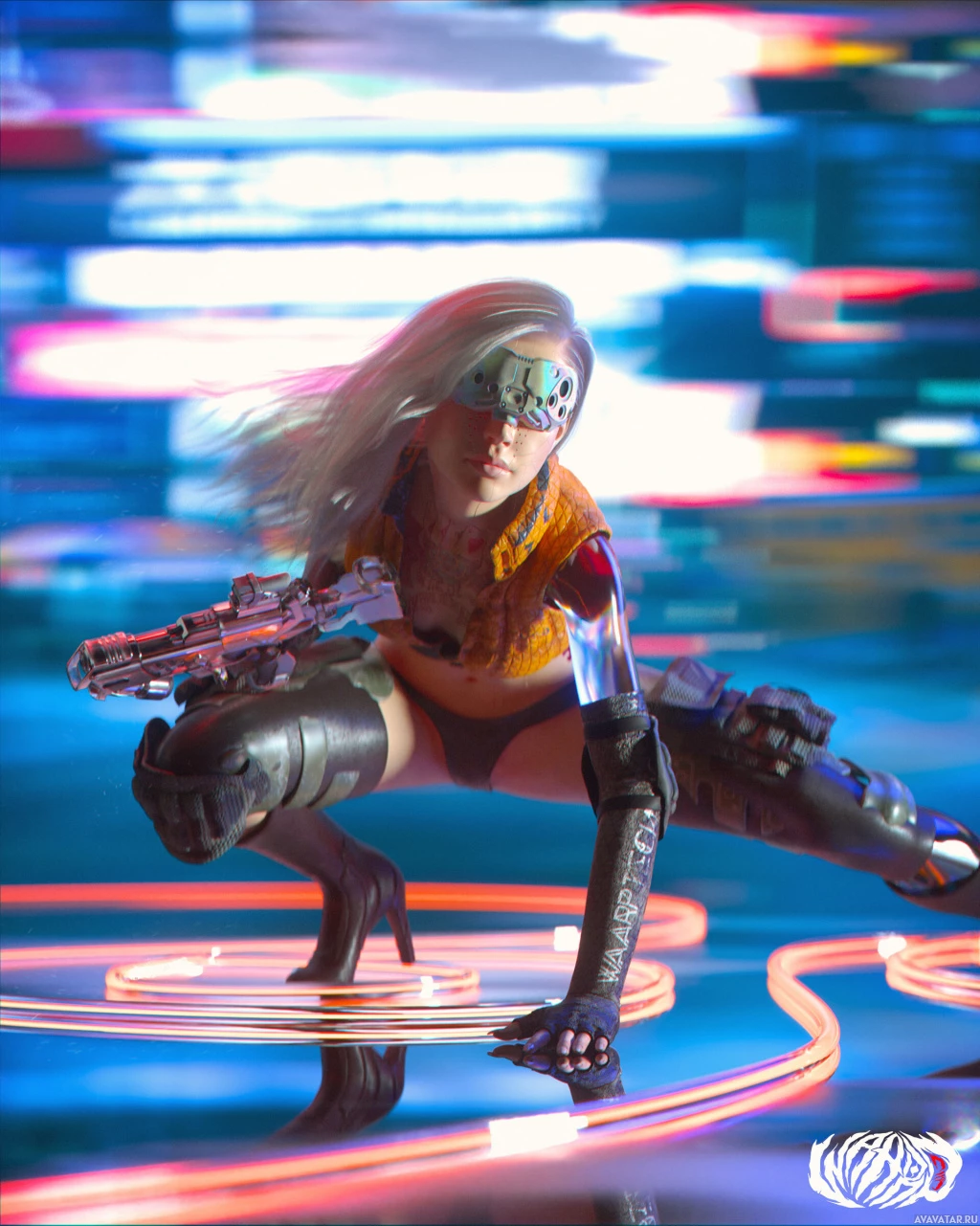 На картинке изображен персонаж с белыми волосами, одетый в костюм на тему научной фантастики, который включает в себя механические или роботизированные элементы. Ее рука согнута в локте и держит что-то похожее на футуристическое оружие. Декорации напоминают городскую среду с неоновыми огнями и вывесками на заднем плане.