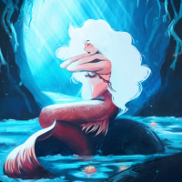 small flowers or petals floating in the water near her feet. The color palette appears to be soft with a dominant cool
