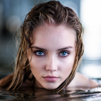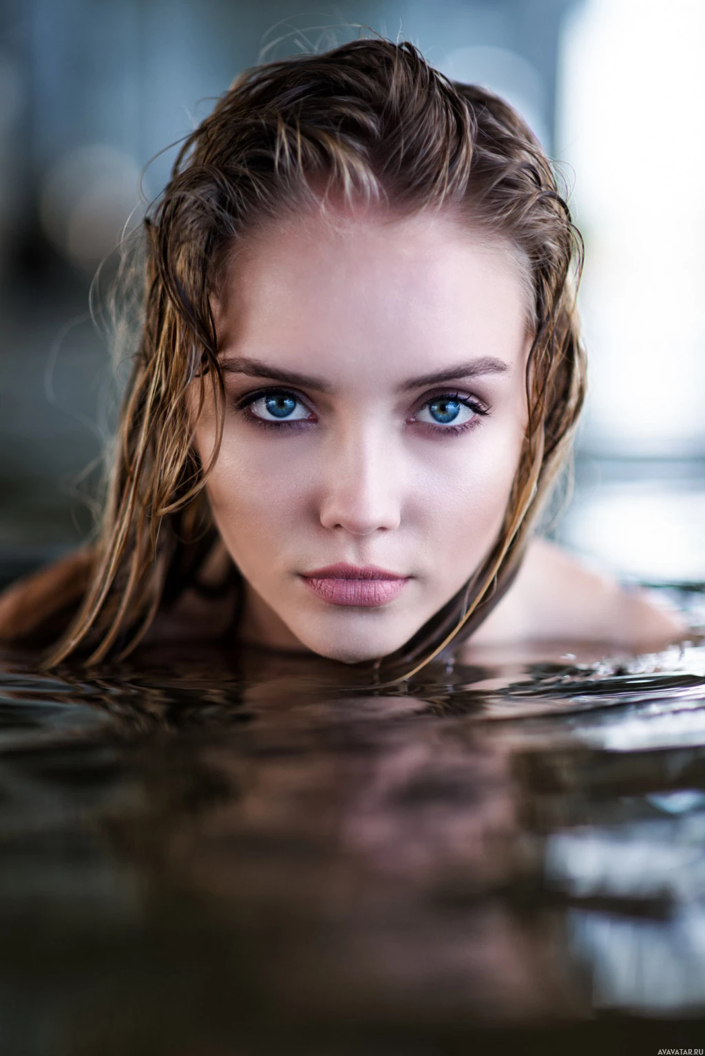 wet hair, likely after swimming or bathing. She is looking directly at the camera with