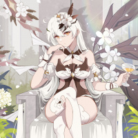an animated character, a female with white hair, wearing a fantasy outfit that includes elements resembling armor or costume. She has large wings on her back, which suggests she may be an angelic or