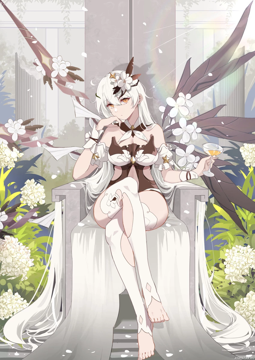 mythical creature in this context. She is seated on what appears to be a throne, surrounded by nature elements like flowers and foliage. The artwork is detailed and colorful, with a magical or fantasy theme.