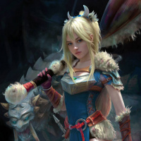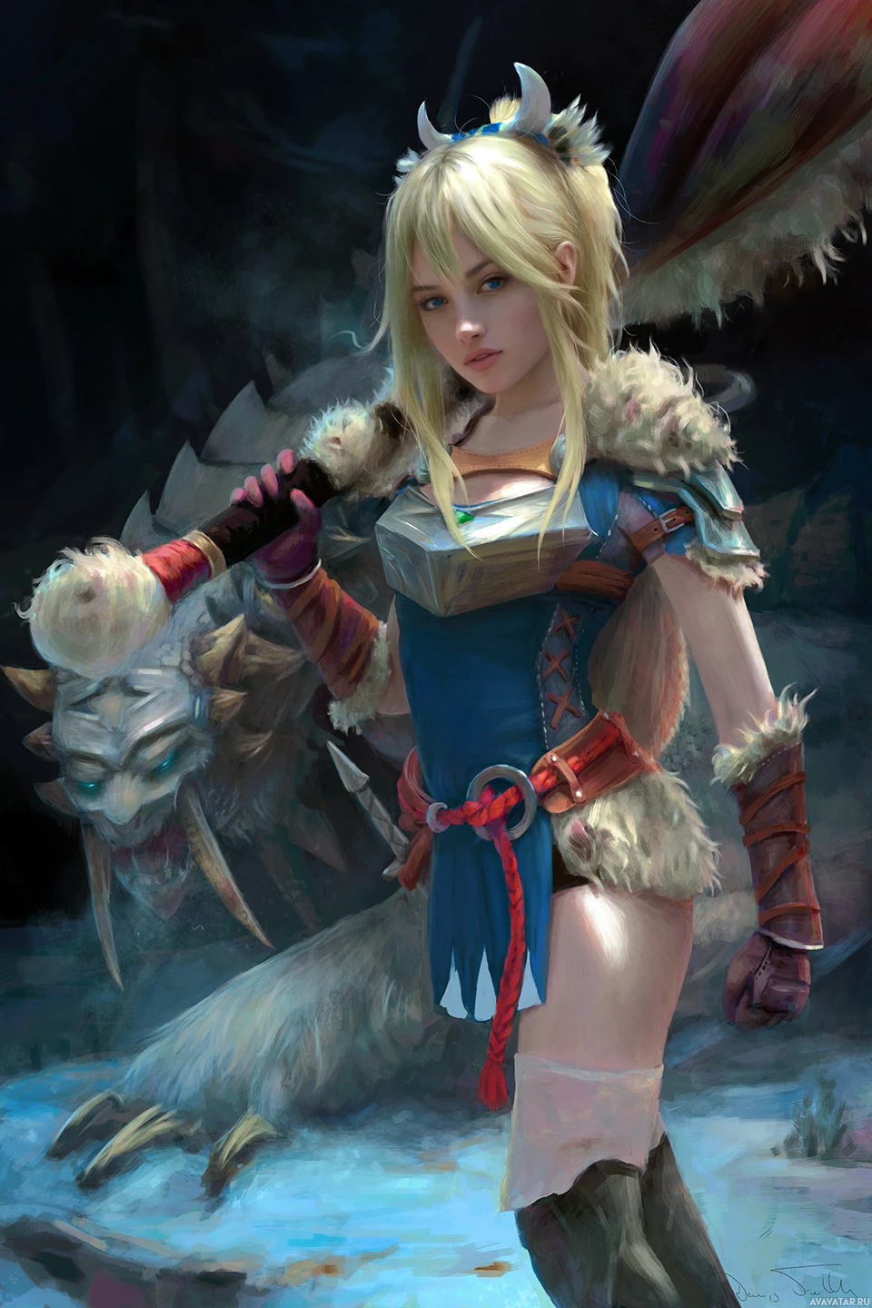 mythical beast in the foreground on her left side. The overall composition and the style of the armor suggest this is an illustration from a fantasy-themed story or game.