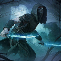 the mystique of the figure. They are holding a sword in one hand and a staff in the other, suggesting they might have