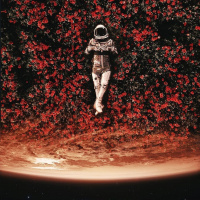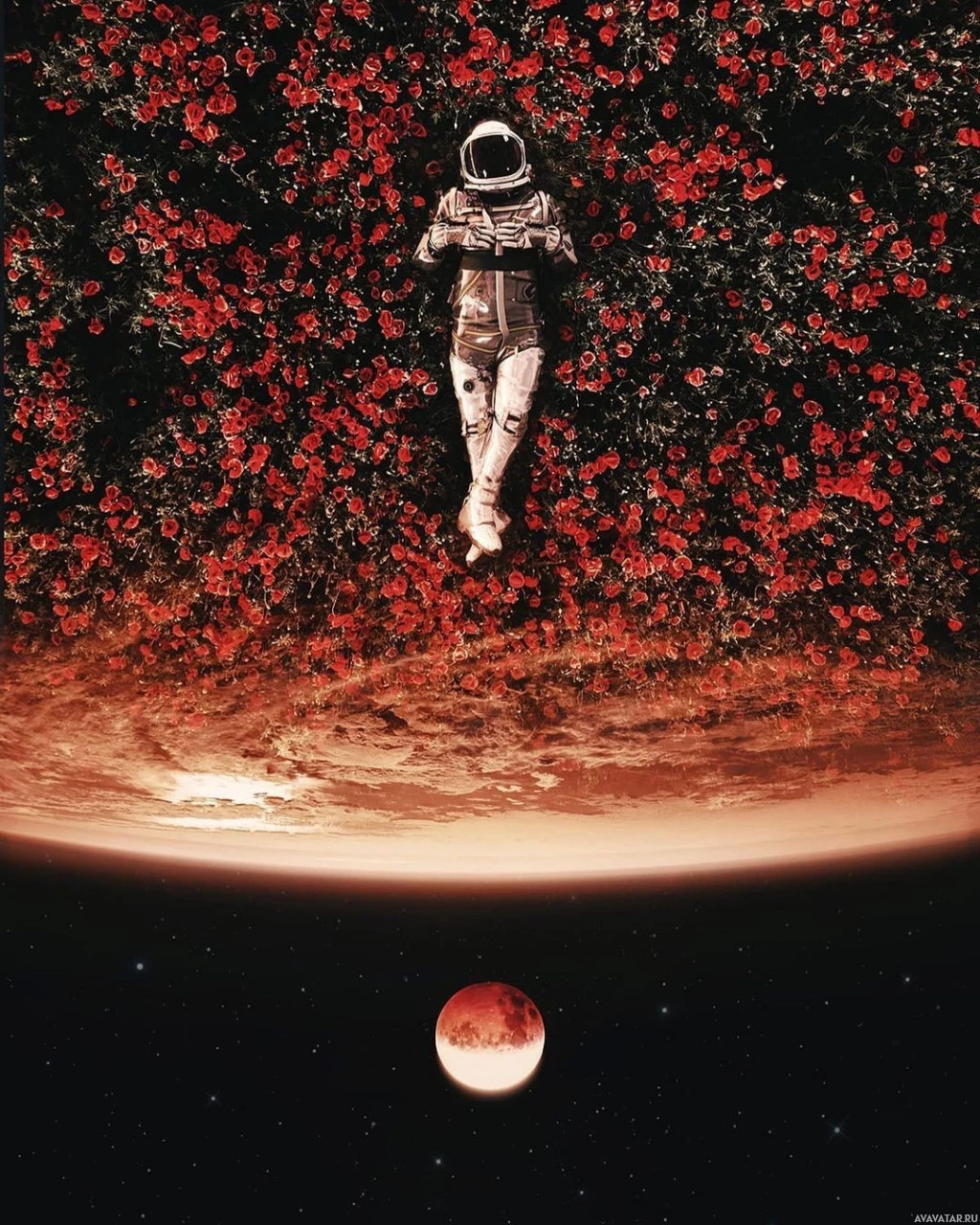 a red sky and flowers that could be representative of Martian flora. In the sky, there is also a visible
