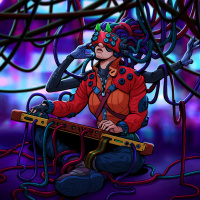 sort of headgear or helmet, and is holding onto what looks like a musical keyboard or synthesizer. The setting seems to have an electrical or electronic theme, possibly suggesting a scene from