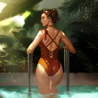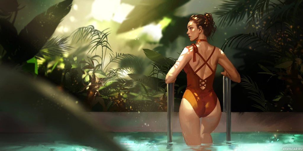 На картинке изображен стилизованный человек, возможно, женщина, стоящая в естественном бассейне или реке, окруженной пышной зеленью. На ней купальник без рукавов, и она стоит спиной к зрителю. Ее поза наводит на мысль, что она, возможно, делает перерыв или размышляет о чем-то, наслаждаясь водой. Произведение искусства передает ощущение спокойствия и гармонии с природой.