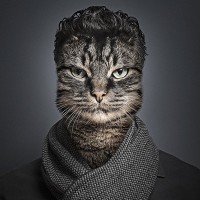 На картинке есть человек, который был изменен в цифровом виде, чтобы иметь кошачьи черты. Лицо и осанка человека были изменены, чтобы имитировать кошку, в комплекте с ушами, усами и бдительным или несколько недовольным выражением. Они носят шарф и то, что кажется темным цветом верхней части или куртки. Фон нейтральный по цвету, без дополнительного контекста.