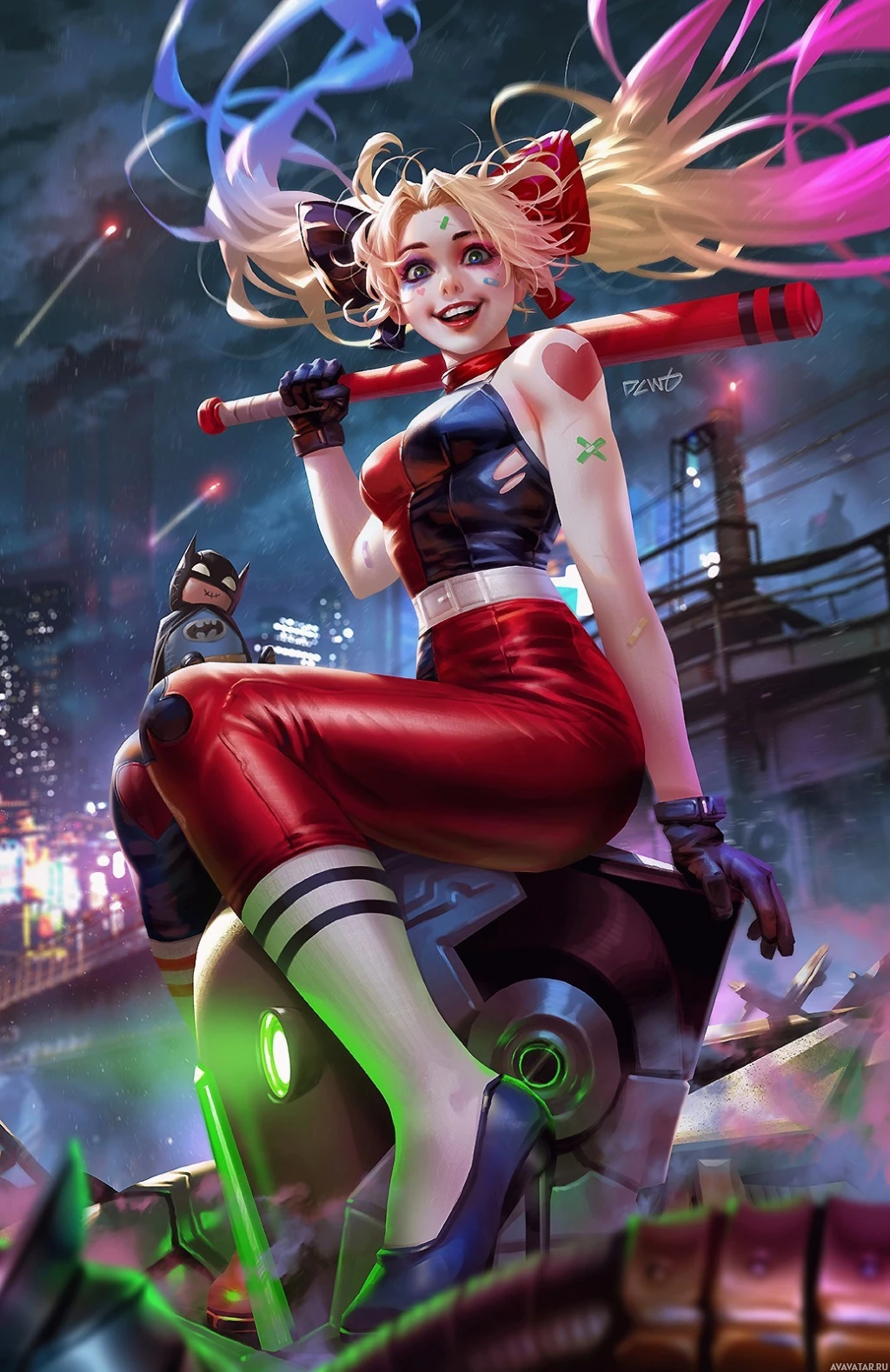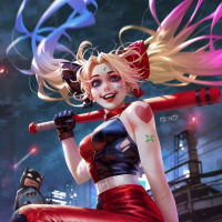 Harley Quinn, a well-known comic book villain and anti-hero associated with the Batman universe. She is depicted with her signature hair color (black), wearing red and blue attire with blonde highlights in her hair, which are colors typically associated with the character's