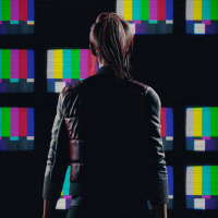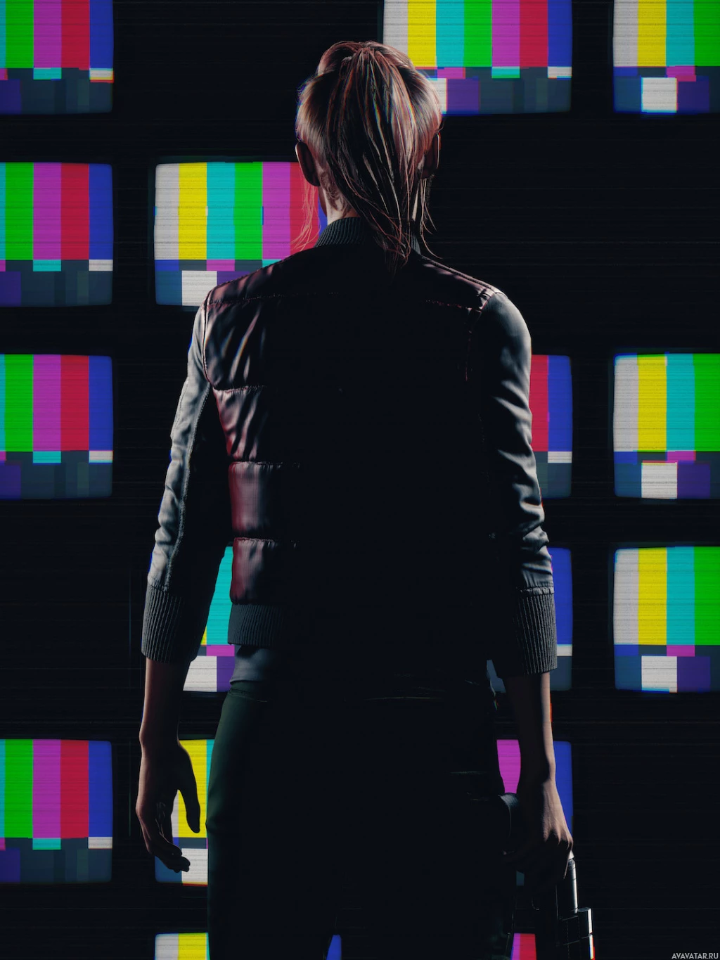 tech environment and the stylized appearance of the screens. The image has a dark and moody atmosphere.