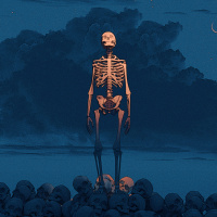 The image shows a skeleton standing on a rock in the middle of