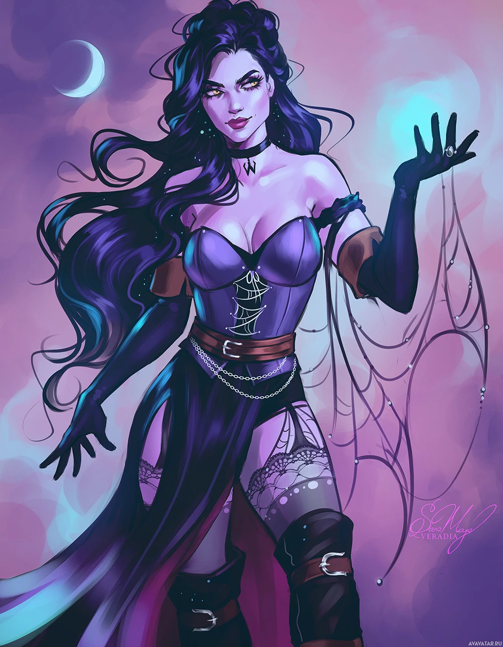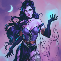 a female character who appears to be from a fantasy or dark-themed setting. She has long,