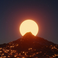 early morning or late evening lighting conditions. In the center of the image, there's a large, round, glowing ball that resembles a moon or