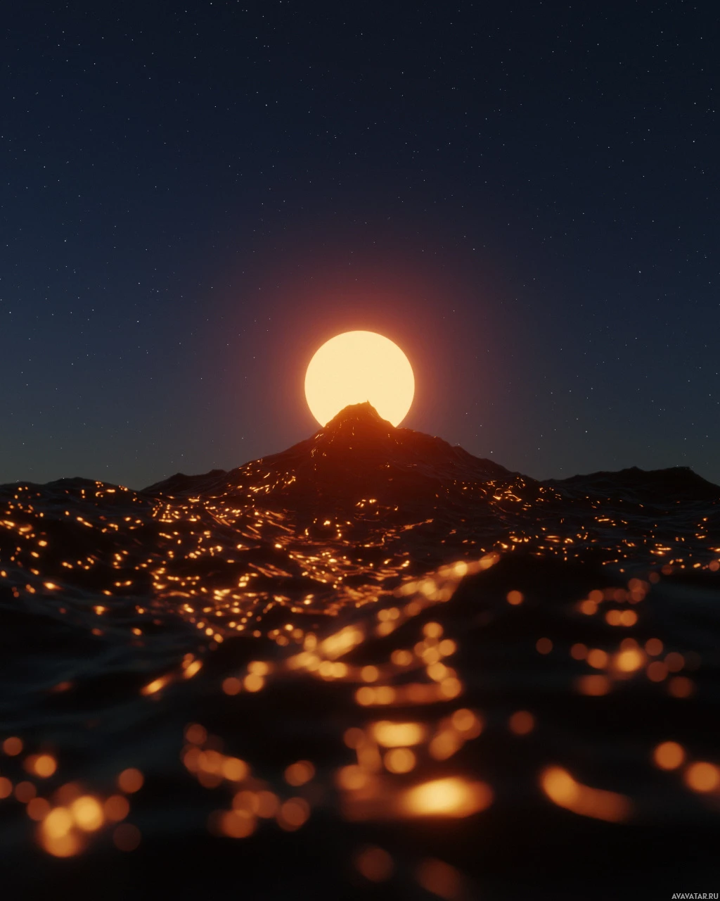 celestial body, there appears to be a small mountain or hill silhouetted against the sky. The water surface is visible with ripples and tiny lights that could be phytoplankton, reflecting
