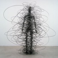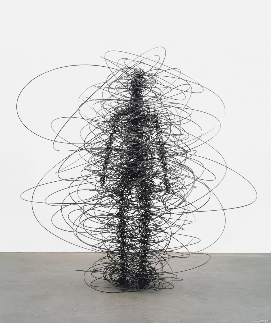 Картинка показывает сложную художественную инсталляцию с человеческой фигурой, окруженной многочисленными переплетенными проволочными нитями. Эти проволочные нити создают сложный и хаотический рисунок, который окутывает фигуру, создавая впечатление движения или беспорядка. Этот тип скульптуры часто ассоциируется с концептуальным стилем искусства и может рассматриваться как исследование формы, пространства и восприятия.