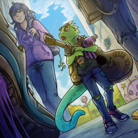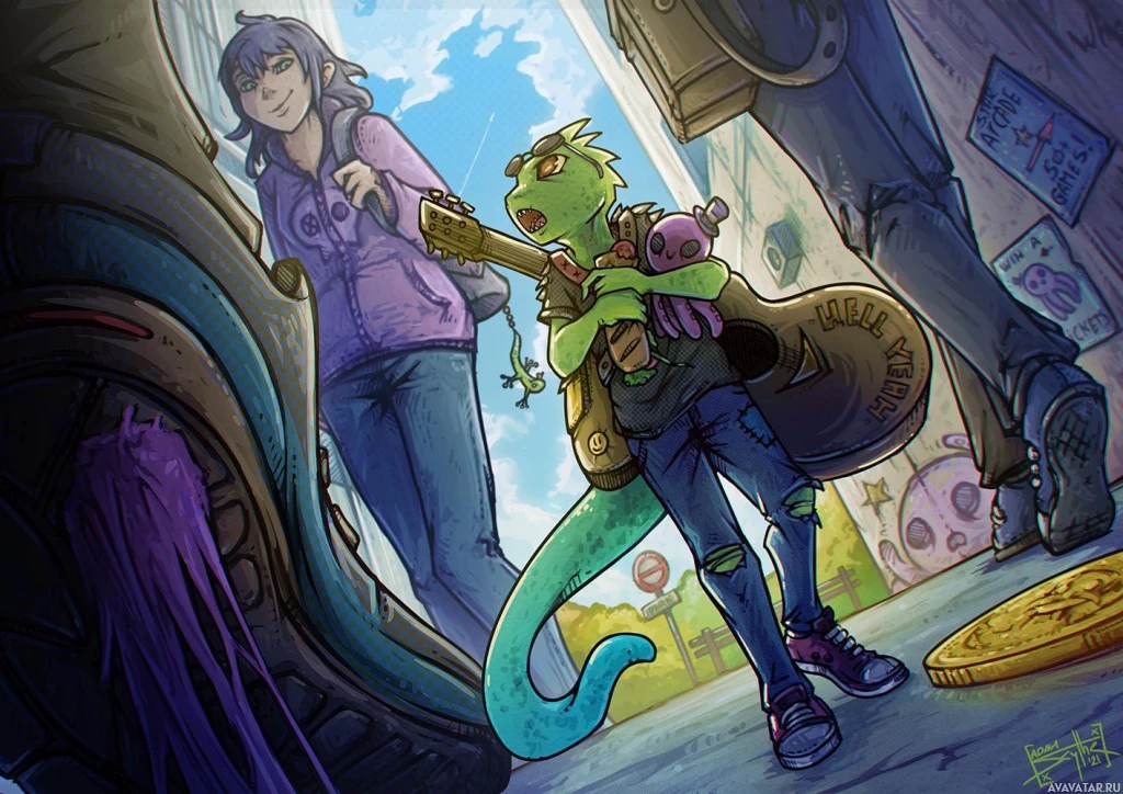 character with a guitar, seemingly playing or about to play, standing in the foreground with a surprised or concentrated expression. Behind the lizard, there are several other characters, including what appears to be a human and another