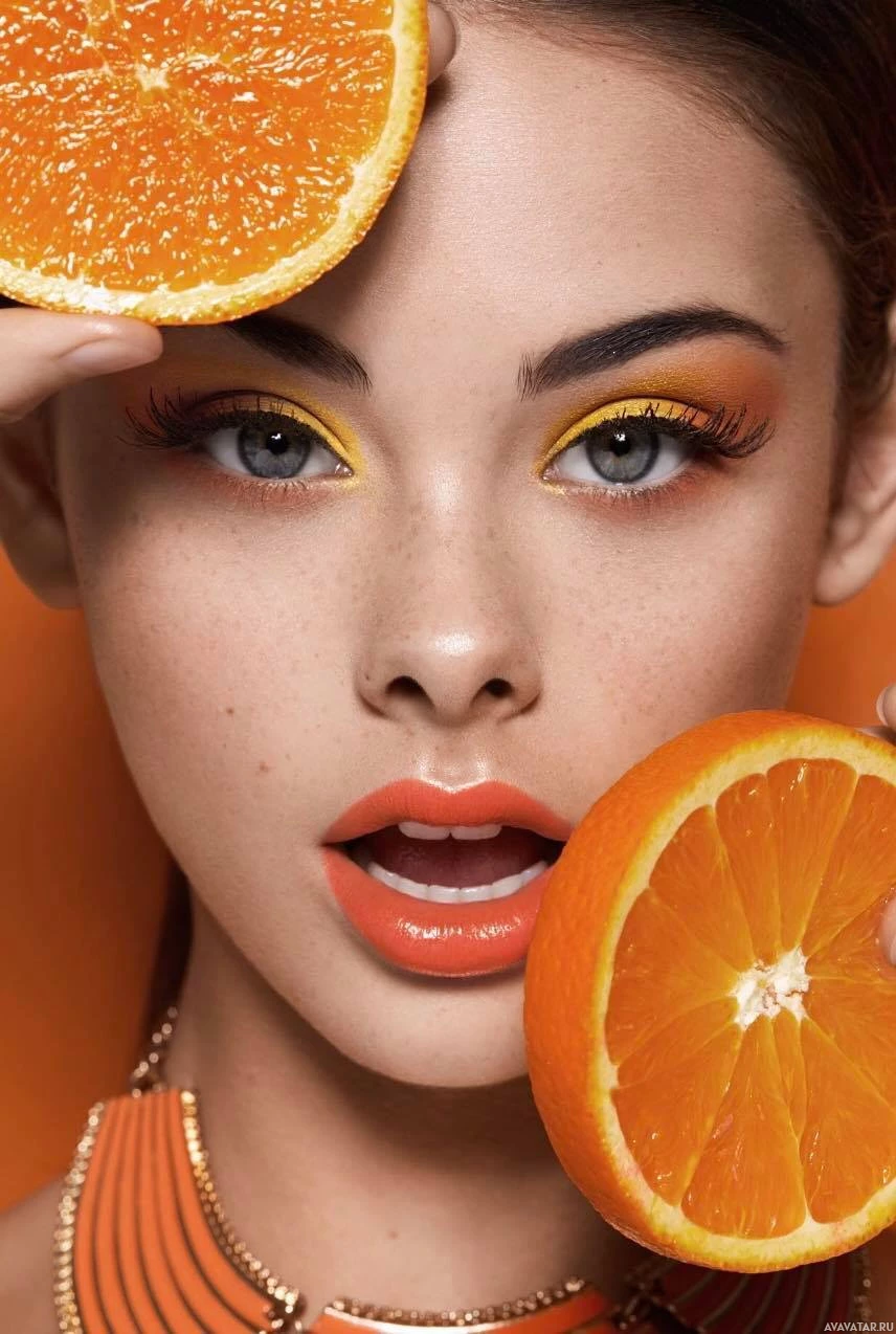 slices of oranges that she is holding up to her face. Her pose suggests that she might be advertising or promoting something related to oranges, possibly in terms of beauty products or health benefits associated with