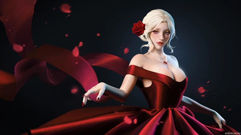 red dress and has a rose tucked into her hair. Her expression appears serene, and she holds what looks like a curtain or fabric in one hand while the other hand is resting on her thigh. The background features