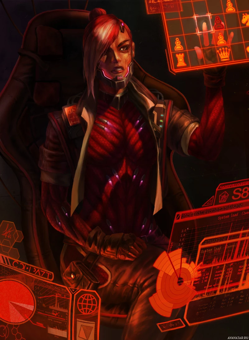 control room, surrounded by various electronic and technological interfaces. The overall style of the artwork suggests it could be related to