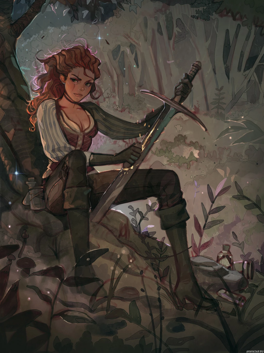 На картинке изображен персонаж женского пола с рыжими волосами, сидящий на камне в окружении, похожем на лес. Она держит меч и одета в доспехи, что наводит на мысль о том, что она может быть персонажем фэнтезийной или исторической сюжетной линии.