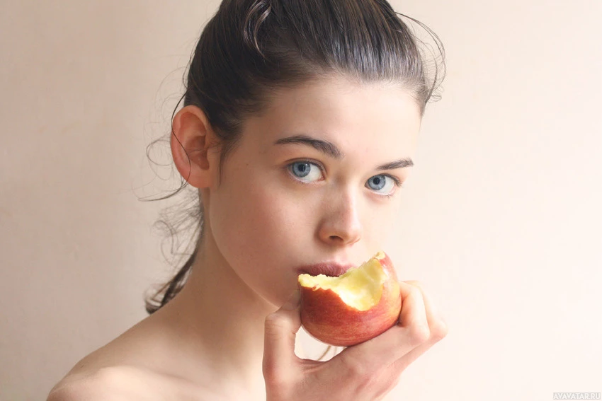 short hair and appears to be eating an apple. The apple is clearly visible in her hand, held up to her mouth as she takes a bite of it. The background is neutral and does not contain any