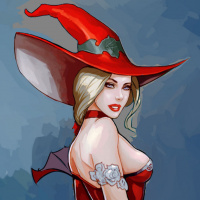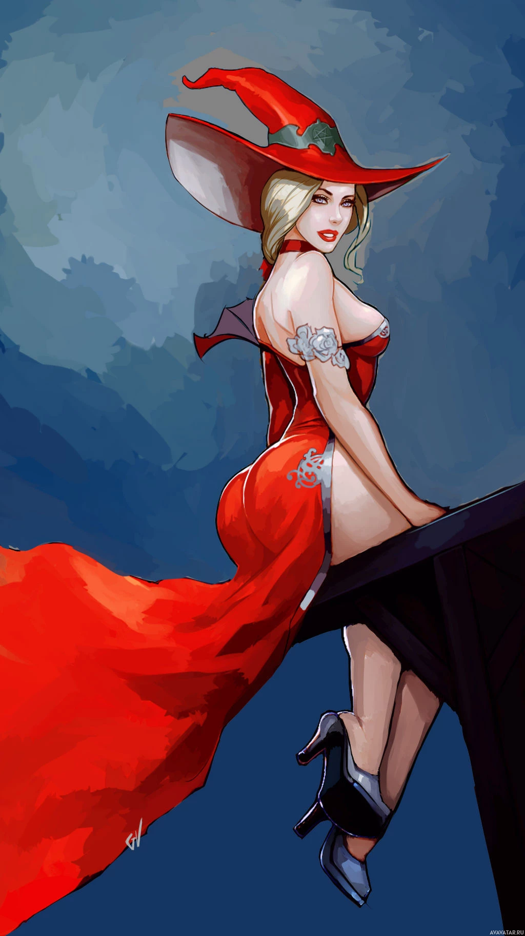 a female character wearing a witch's hat and a red dress. She is depicted from behind, which highlights her silhouette against a dark background that appears to be