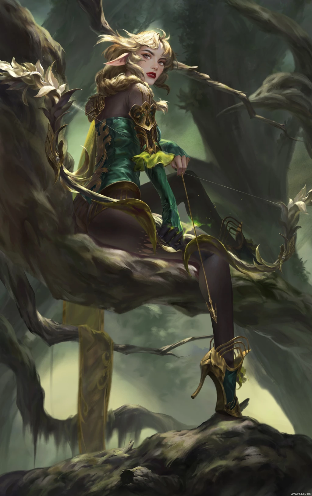 На картинке эльфийка изображена сзади. Кажется, что она находится в фантастической обстановке, одетая в зелено-золотые доспехи с замысловатыми узорами. В левой руке она держит что-то похожее на лук, что наводит на мысль о том, что она, возможно, лучница или искусна в стрельбе из лука. Фон покрыт пышной листвой, что указывает на окружение леса или джунглей.
