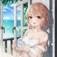 The image shows an animated character, which appears to be a girl, sitting by a window with her legs crossed. She is holding a cup in one hand and seems to be enjoying a drink. There are also some blossoms visible outside the window, suggesting it might be spring or summer.
