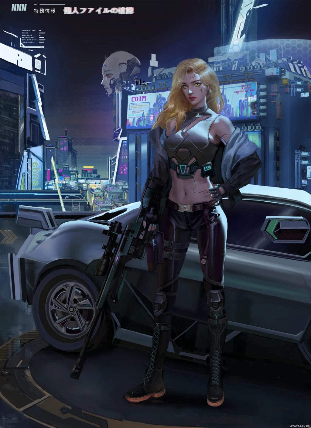 blonde hair, wearing futuristic attire and accessories. She appears to be holding a weapon, which suggests she might be a part of the game's combat or action elements. The background shows a cyberpunk cityscape at night, which fits within the genre of futurism commonly associated with