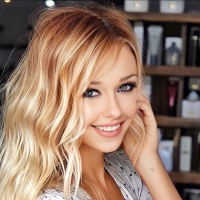 The picture shows a young woman with light hair and a blonde ombré effect. She is wearing a sleeveless top with a floral pattern and has her hand resting on her face as she smiles towards the camera, giving off a friendly and approachable vibe.