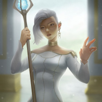 a female warrior or mage. She is wearing a fantasy-themed armor and holding a staff with what seems to be