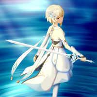 blonde hair styled with side swept bangs and appears to have some sort of glowing or magical element around her head, which could possibly be related to her powers within the context of the game. The setting seems serene, with light reflecting off the water's surface, indicating it might be