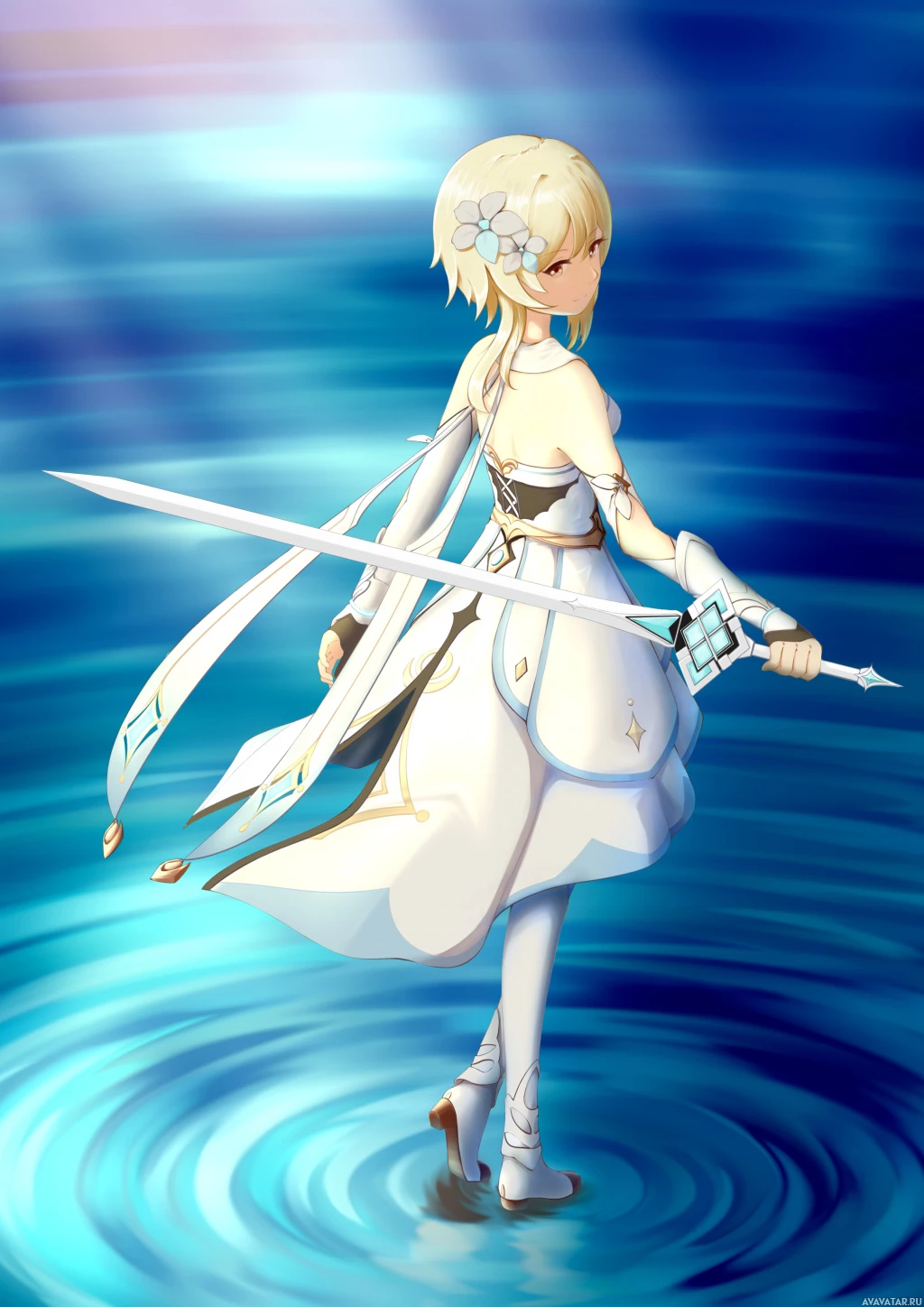 an animated character standing in water. She is wearing a sword on her hip and holding another sword in her hand, suggesting she might be from the game