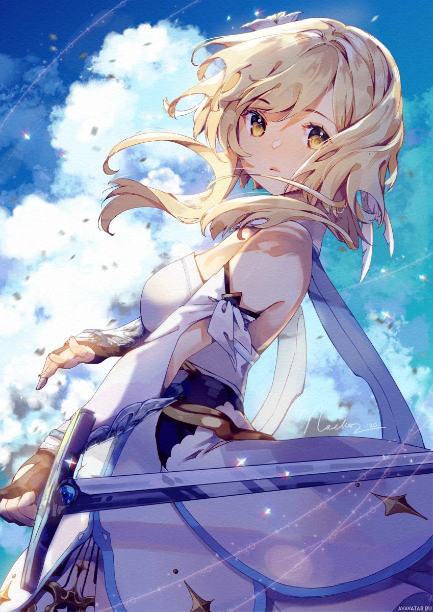 На картинке изображен анимационный персонаж по имени Люмин из игры "Genshin Impact". Она изображена со светлыми волосами, уверенной позой и посохом в руках. Люмин, по-видимому, является частью мифического региона Сумеру, известного своими уникальными персонажами и преданиями.